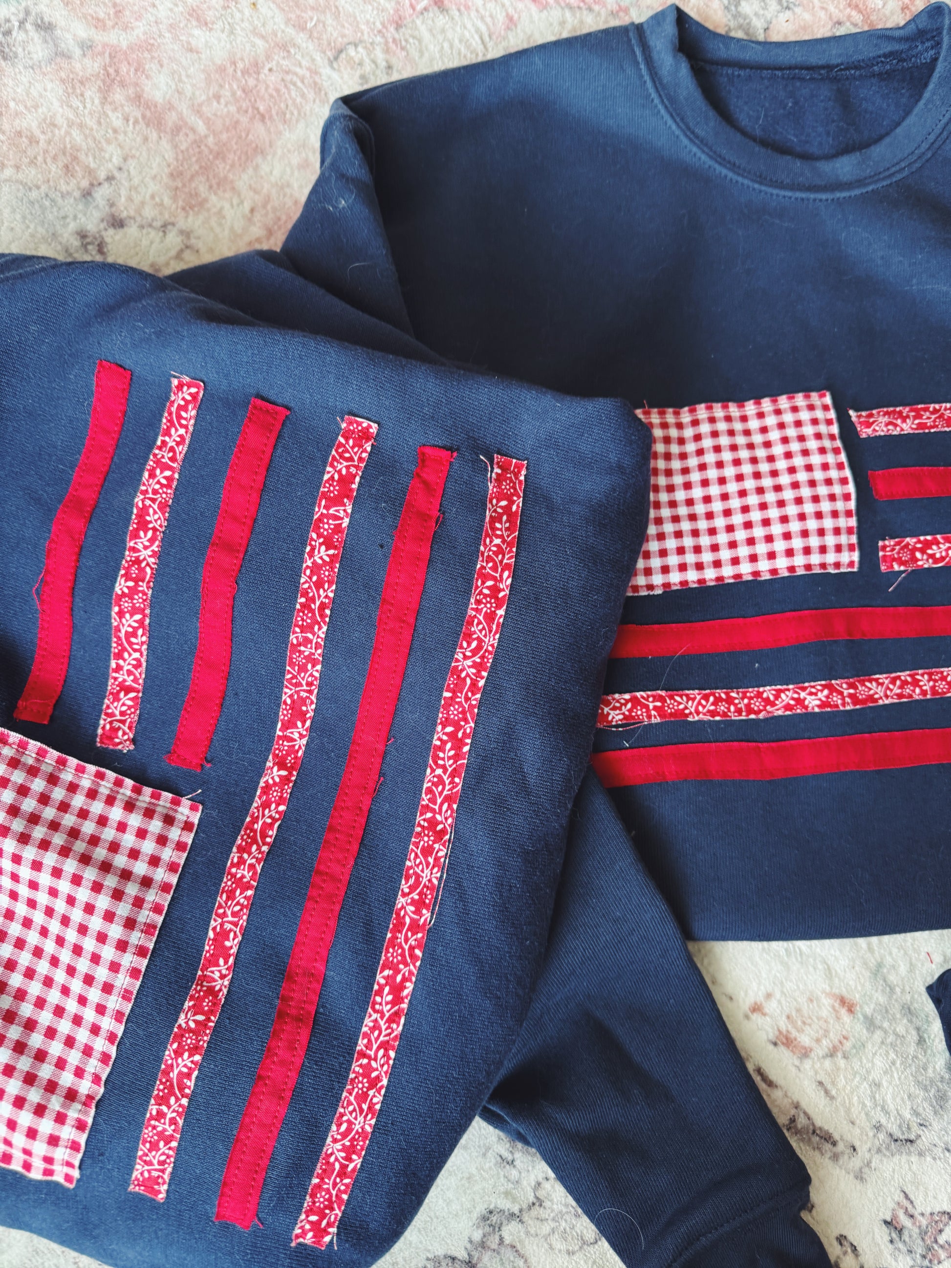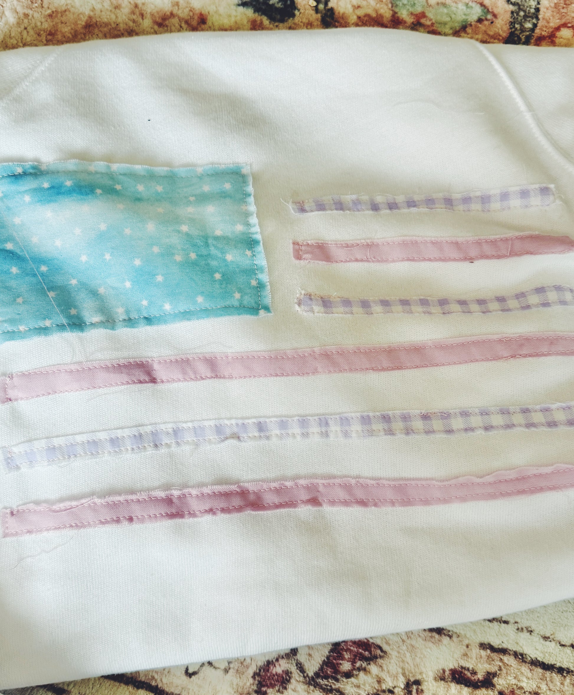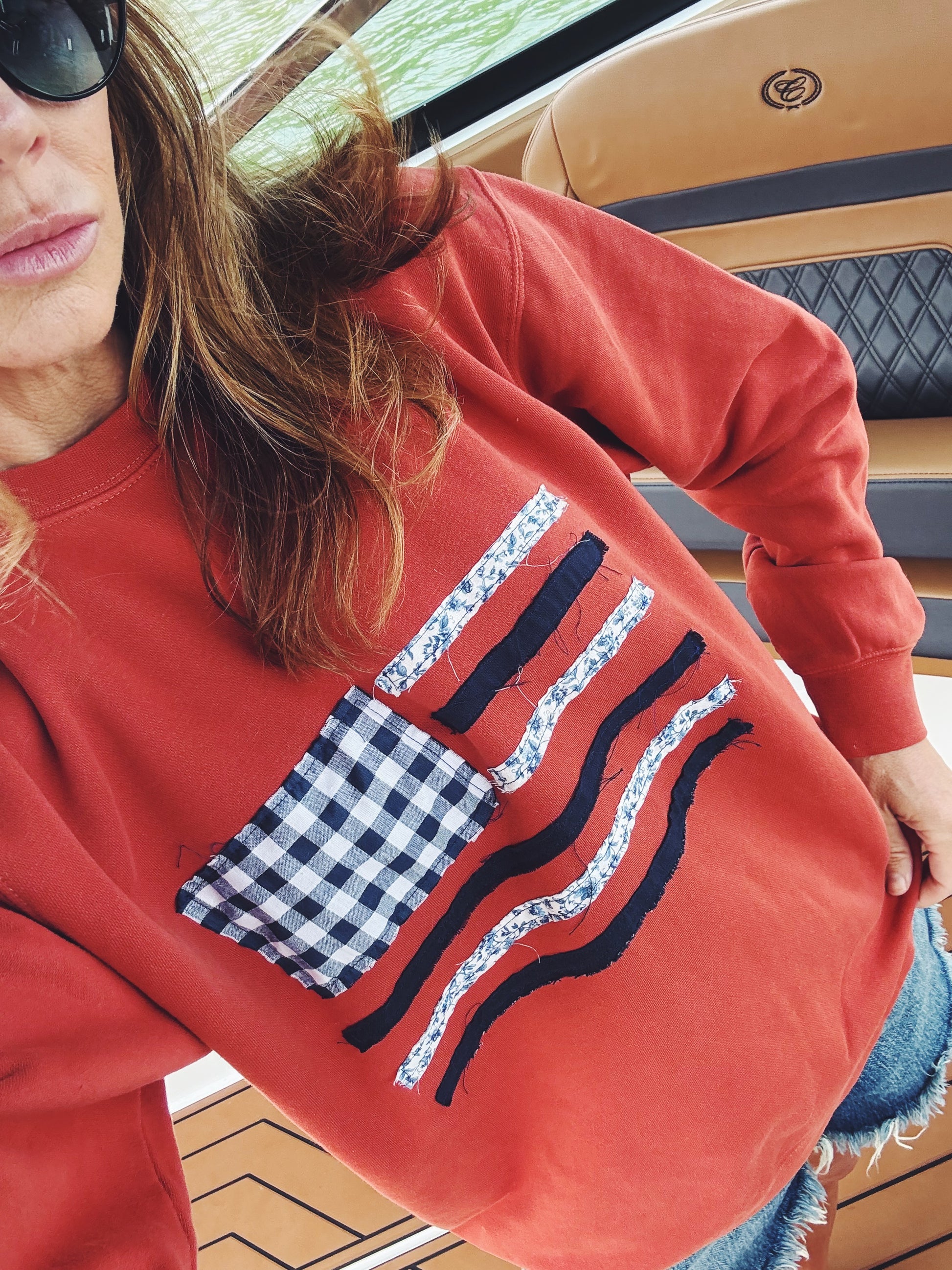 10 day production period ***please air dry***this limited-edition crewneck is my take on american charm. featuring a vintage inspired flag design, it’s a nod to freedom and summertime. each piece is made to order, so whether you want classic red, white, and blue, or a dreamy custom palette that’s all your own, this crew is here to celebrate you!!